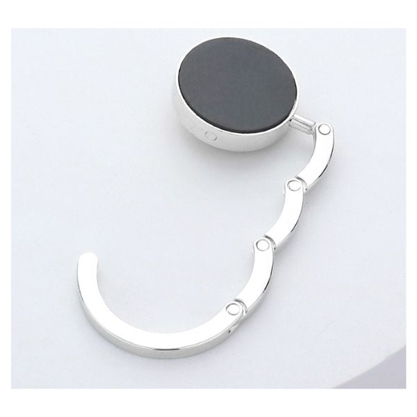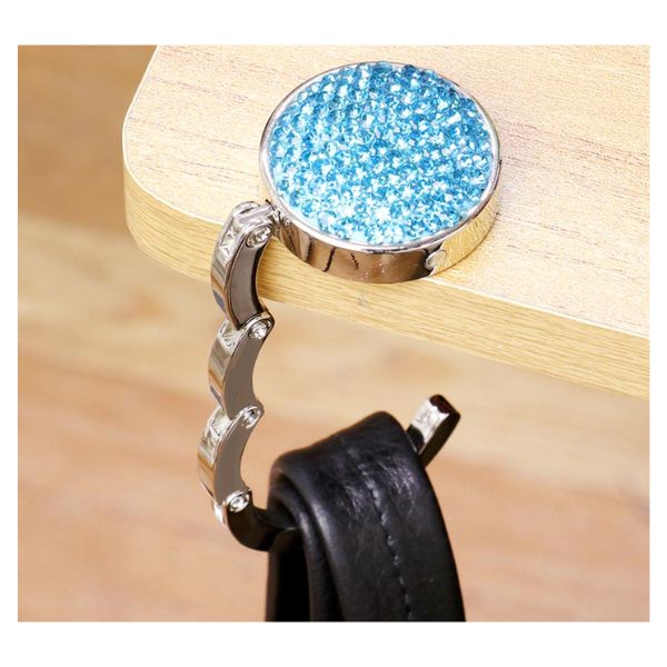 This elegant purse table hook is designed with a dazzling rhinestone and a sleek silver base. It's the perfect accessory to keep your purse off the floor and within reach during outings. The compact and foldable design makes it easy to carry in any handbag.