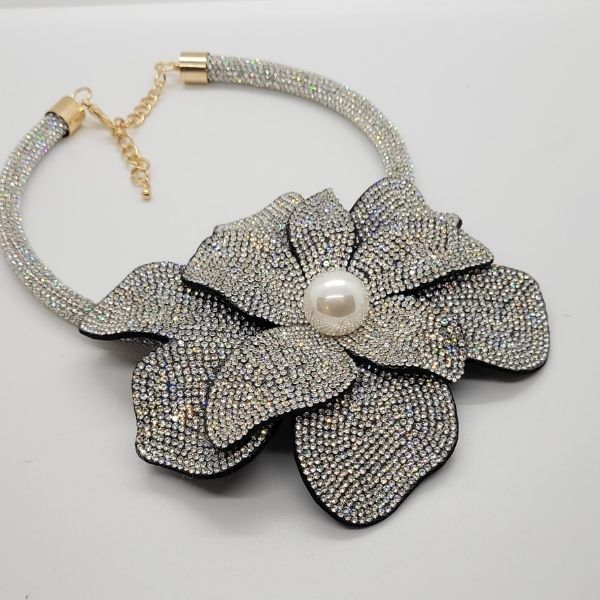 Make a grand entrance with our Rhinestone Flower Pendant Necklace Set. This bold, statement-making piece features an oversized floral pendant meticulously encrusted with sparkling rhinestones that capture the light from every angle. To add a touch of timeless elegance, the design is accented with lustrous pearls, creating a sophisticated balance between high-shine glamour and classic grace. Perfect for formal events, weddings, or whenever you want your accessories to do the talking.