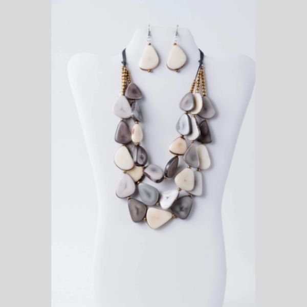 Crafted with love, this handmade piece makes for an elegant everyday accessory. Tagua, a plant-based vegetable sourced from South American palm trees, is not only sustainable and durable but also exceptionally beautiful. This exquisite necklace comes with matching earrings, and features an adjustable cord slider for a perfect fit. This work of art is truly a must-have!